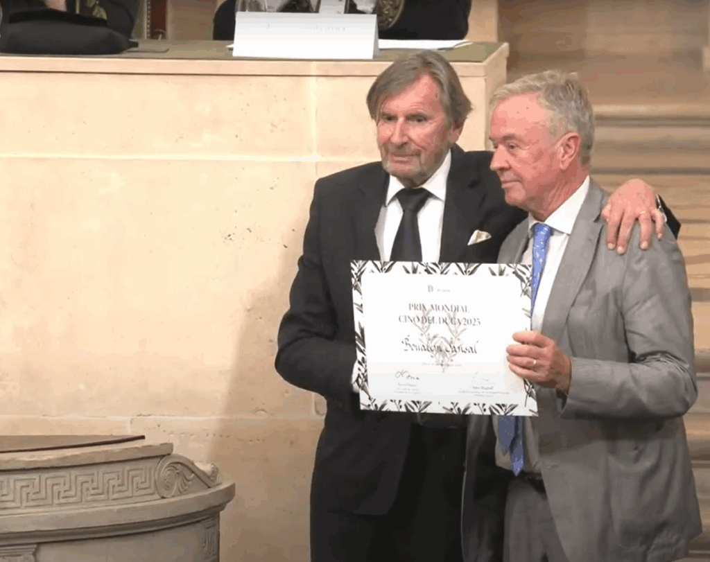 18 juin 2025 : remise du Prix mondial Cina del Duco, de l’Académie française, à Boualem Sansal. Son éditeur, Antoine Gallimard, le reçoit en l’absence de l’auteur, de la main de Daniel Rondeau, de l’Académie française